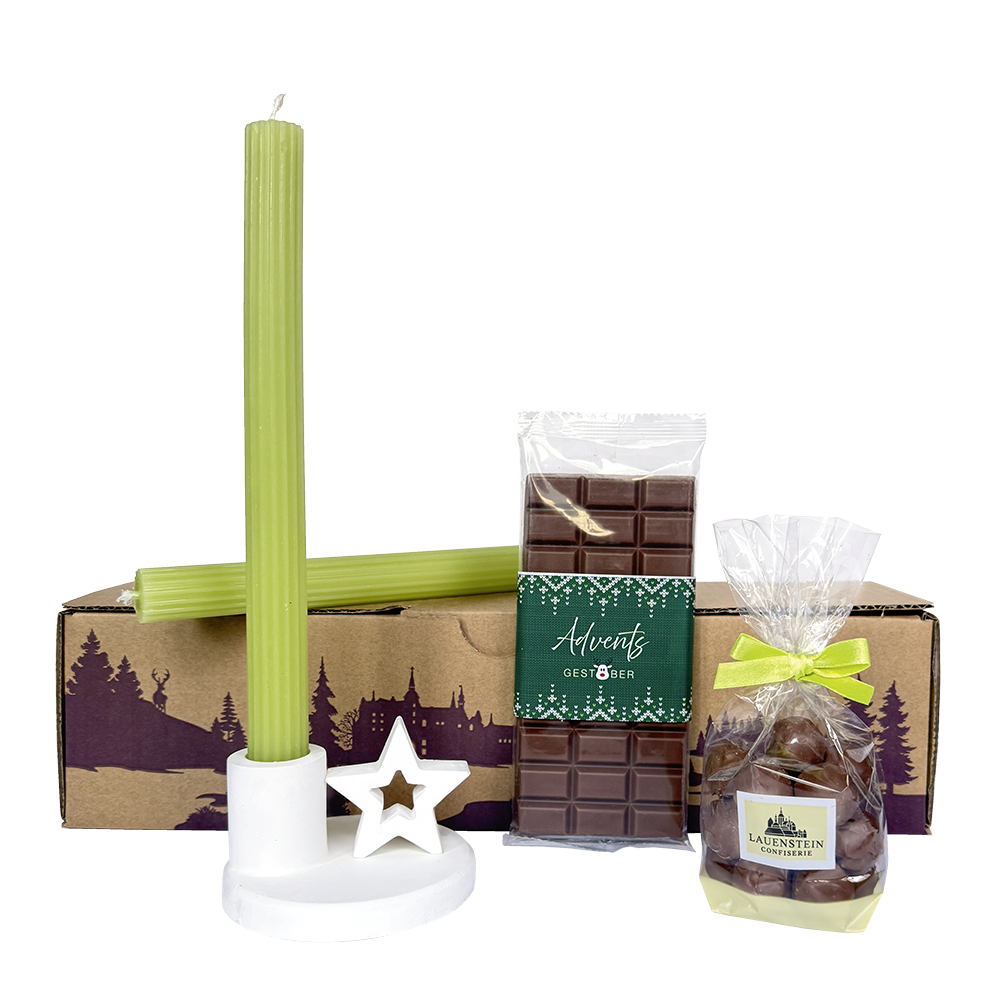Enthalten sind ein Kerzenleuchter aus hochwertigem Betonguss mit zwei passenden Kerzen, ein Beutel Nougat Mini-Kugeln sowie eine Vollmilchschokolade.