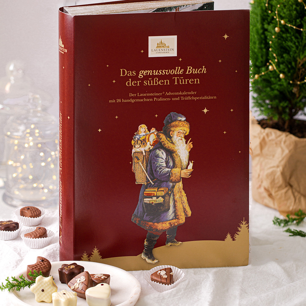 In einem eleganten, weihnachtlichen Rot gekleidet, ist dieser Kalender eine Hommage an die klassische Weihnacht und ein stilvolles Schmuckstück für Ihr Zuhause. Doch sein wahrer Schatz verbirgt sich im Inneren. Hinter jedem der 24 Türchen wartet eine mit Liebe und von Meisterhand gefertigte Trüffel- oder Pralinenspezialität aus unserer Lauensteiner Manufaktur.