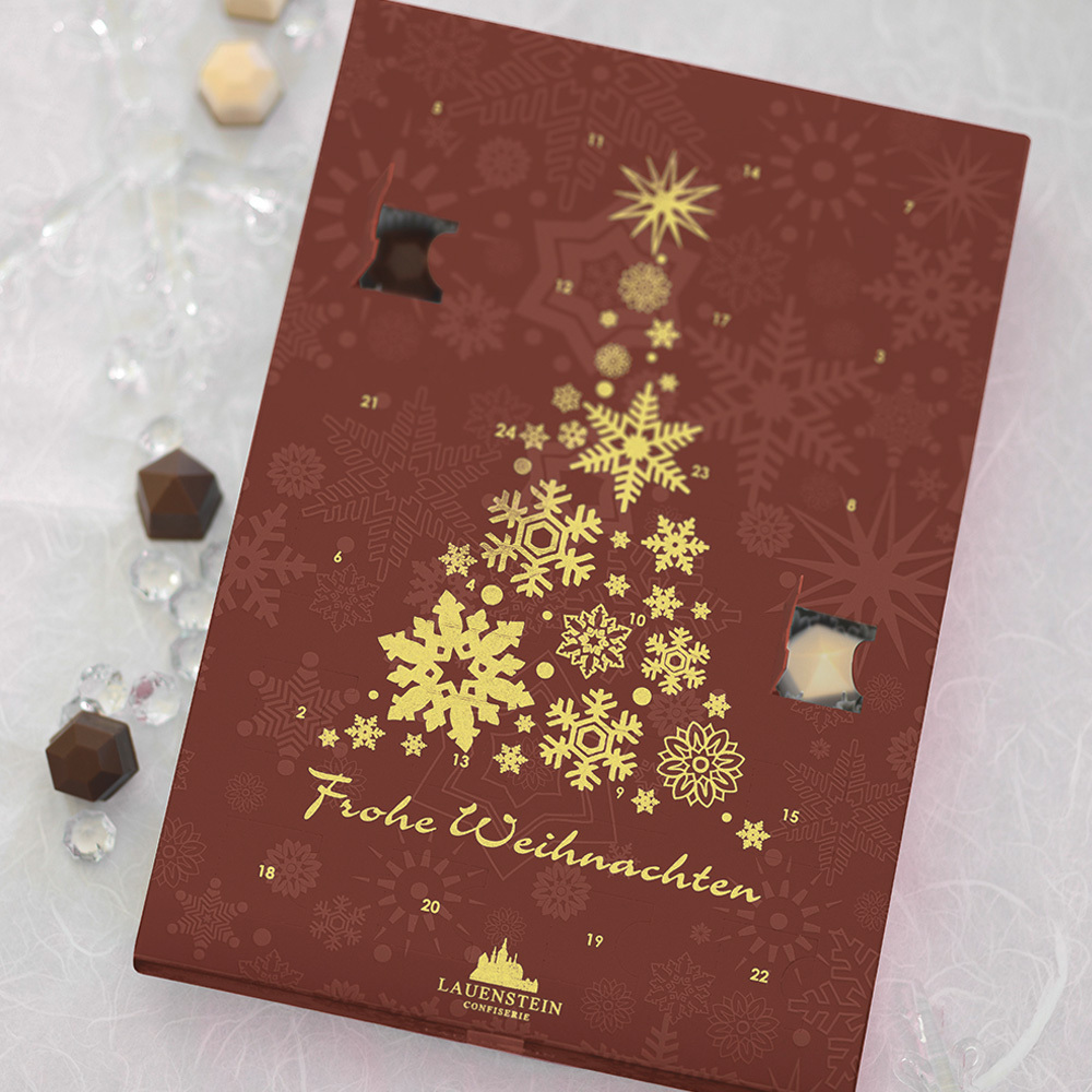 Hinter jedem der 24 Türchen verbirgt sich eine Kostbarkeit, die beweist, dass wahre Größe nicht von den Abmessungen abhängt. Unsere Mini-Pralinen, kunstvoll geformt wie geschliffene Kristalle, sind kleine Juwelen aus der meisterhaften Hand unserer Confiseure. Jeden Tag wartet ein funkelnder Genussmoment darauf, von Ihnen entdeckt zu werden.