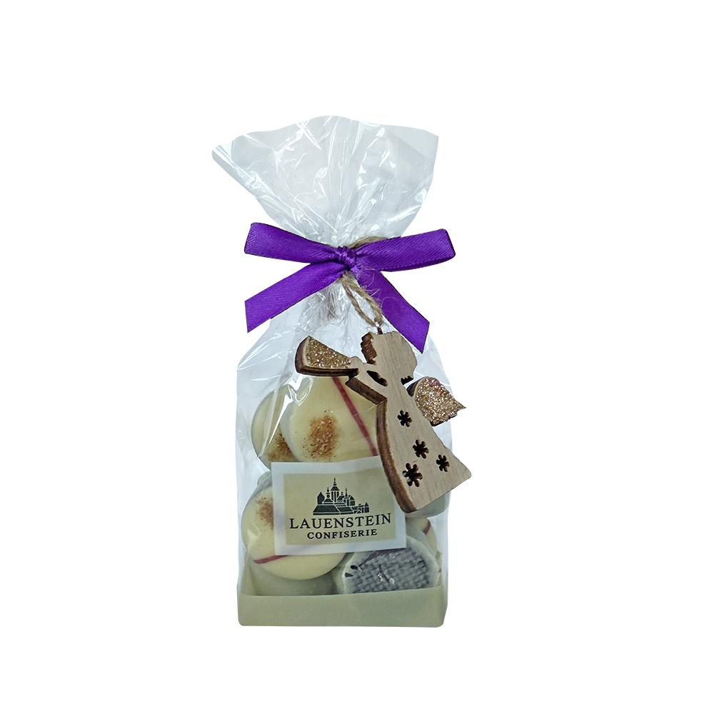 Ihre Lieblingspraline sortenrein im Cellobeutel mit schönen Weihnachtsanhänger. Zum selbstgenießen oder als kleines Mitbringsel.