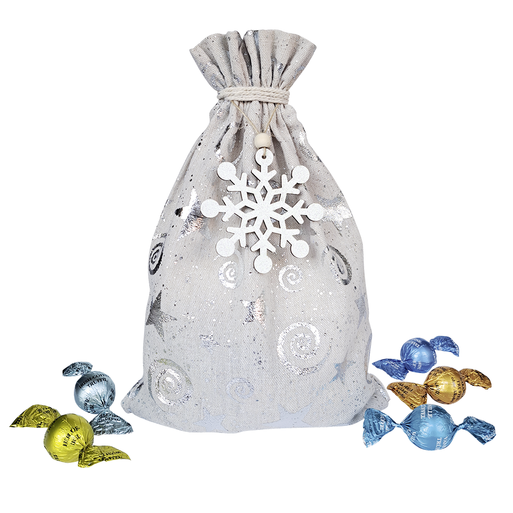 BUNT GEWICKELTE GOURMET-KUGELN IM SÄCKCKEN31 feine Gourmetkugeln in verschiedenen Geschmacksvarianten. 10-fach sortiert im edel bedruckten Leinensäckchen mit Sternenmotiv.Ideal als Mitbringsel, Tischdeko oder als Geschenk zum Nikolaus oder Weihnachten.