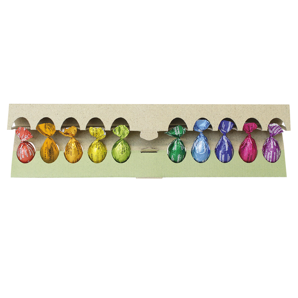 Zucker, Kakaobutter, Schlagsahne, Vollmilchpulver, Kakaomasse, Haselnüsse, Macadamiamus, Butter, Glukosesirup, Eierlikör, Feuchthaltemittel (Sorbit), Mandeln, Butterreinfett, Magermilchpulver, Orangenlikör, Maltodextrin, Marc de Champagne, natürliches Aroma, Whisky, Whisky-Sahnelikör, Emulgator: Lecithine (Soja, Sonnenblumen, Raps), Mangosaft-Konzentrat, Batavia Arrak, Himbeerpulver, Weinbrand, Säuerungsmittel (Citronensäure), Sahnepulver, Vanilleextrakt, Kurkuma, Bourbon-Vanillepulver, Bourbon-Vanille-Extrakt, Orangenöl.