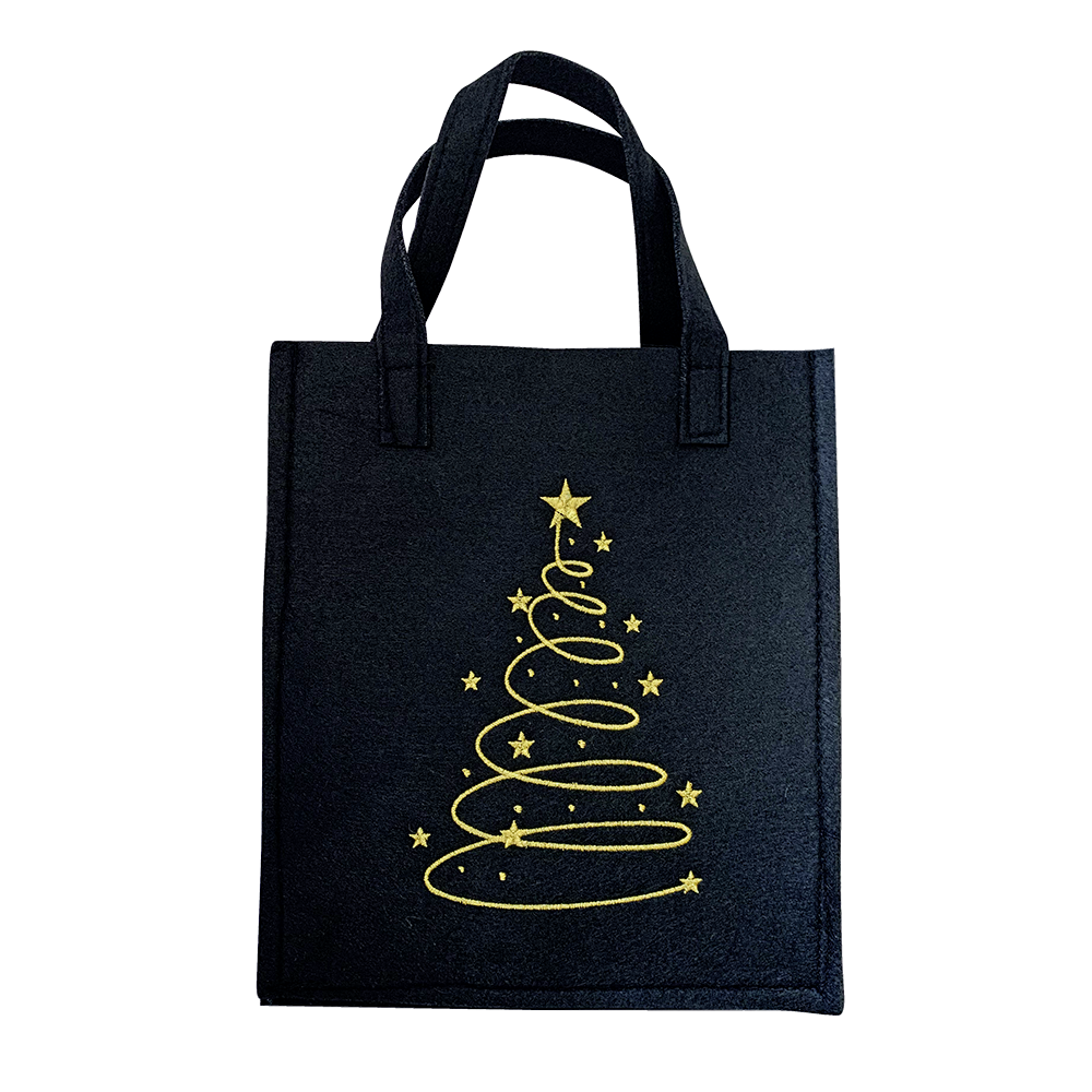 Weihnachtliche Filztasche in der edlen Farbkombi schwarz /Gold mit Weihnachtsbaum Motiv. Hochwertige Weihnachtstasche zum befüllen von Weihnachtsgeschenken für die Familie, Kundengeschenken und Mitarbeitergeschenken.Die Tasche aus Filz mit Weihnachtsmotiv ist 20 cm groß (ohne Henkel gemessen), 18 cm breit und 5 cm tief.
