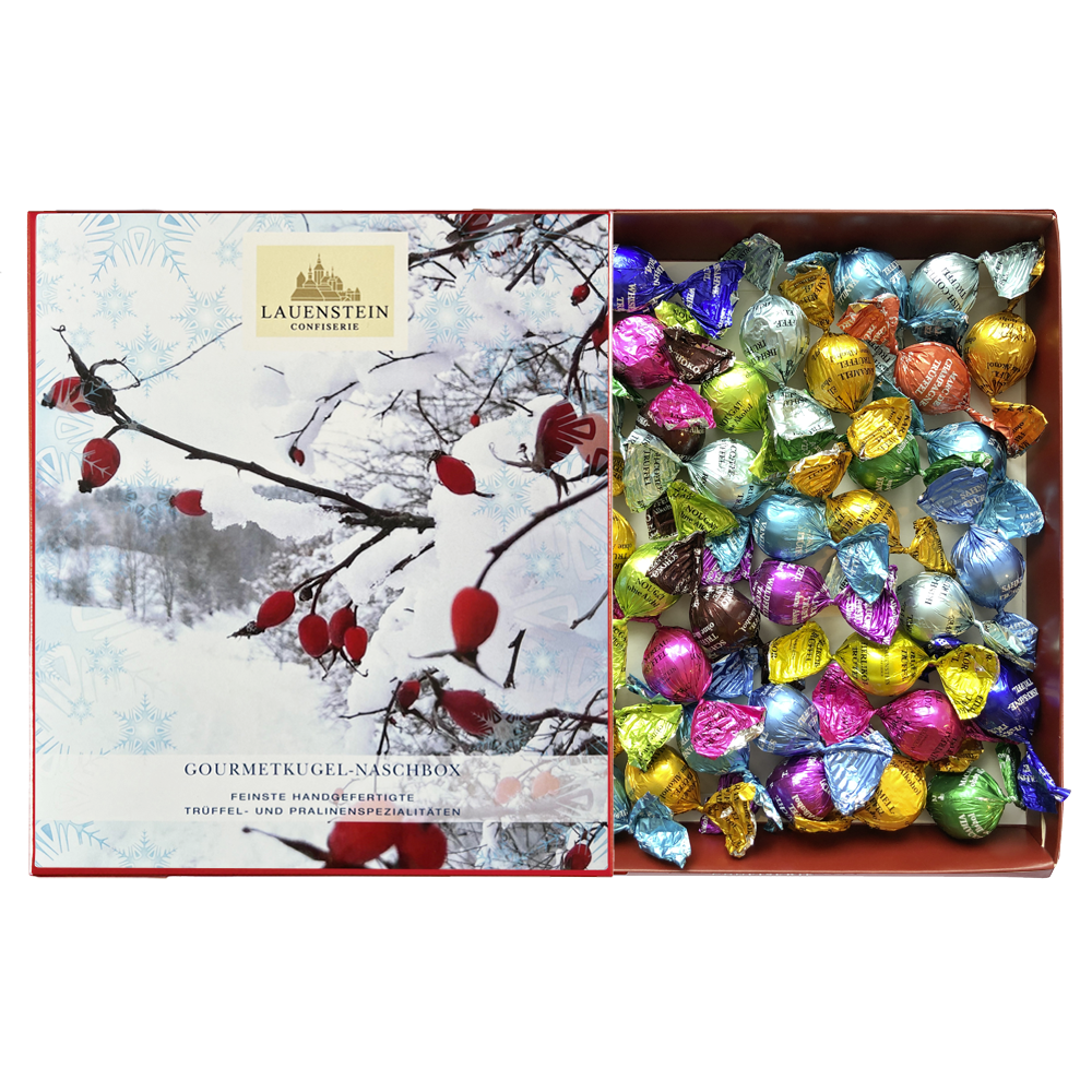 Zucker, Kakaobutter, Schlagsahne, Vollmilchpulver, Kakaomasse, Haselnüsse, Butter, Magermilchpulver, Glukosesirup, Feuchthaltemittel (Sorbitsirup), Macadamiamus, Butterreinfett, Weinbrand, Mandeln, Eierlikör, Wasser, Emulgator: Lecithine (Soja, Sonnenblumen, Raps), Mandellikör, Orangenlikör, Batavia Arrak, Whisky, Marc de Champagne, Maltodextrin, Aroma, natürliches Aroma, Whisky-Sahnelikör, Himbeerpulver, Röstkaffee, Mangosaft-Konzentrat, Säuerungsmittel (Citronensäure), Vanilleextrakt, Gewürze, Bourbon-Vanille-Extrakt, Bourbon-Vanillepulver, Kurkuma, Orangenöl.