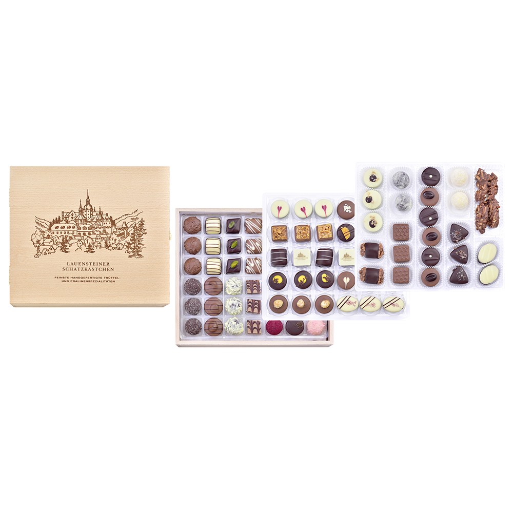 Im Inneren, sicher geborgen, wartet der Schatz unserer Confiserie auf seine Entdeckung: eine großzügige und vielfältige Auswahl unserer besten Trüffel- und Pralinenspezialitäten – auf 3 Lagen verteilt. Eine Reise durch die Welt des Genusses für anspruchsvolle Gaumen: