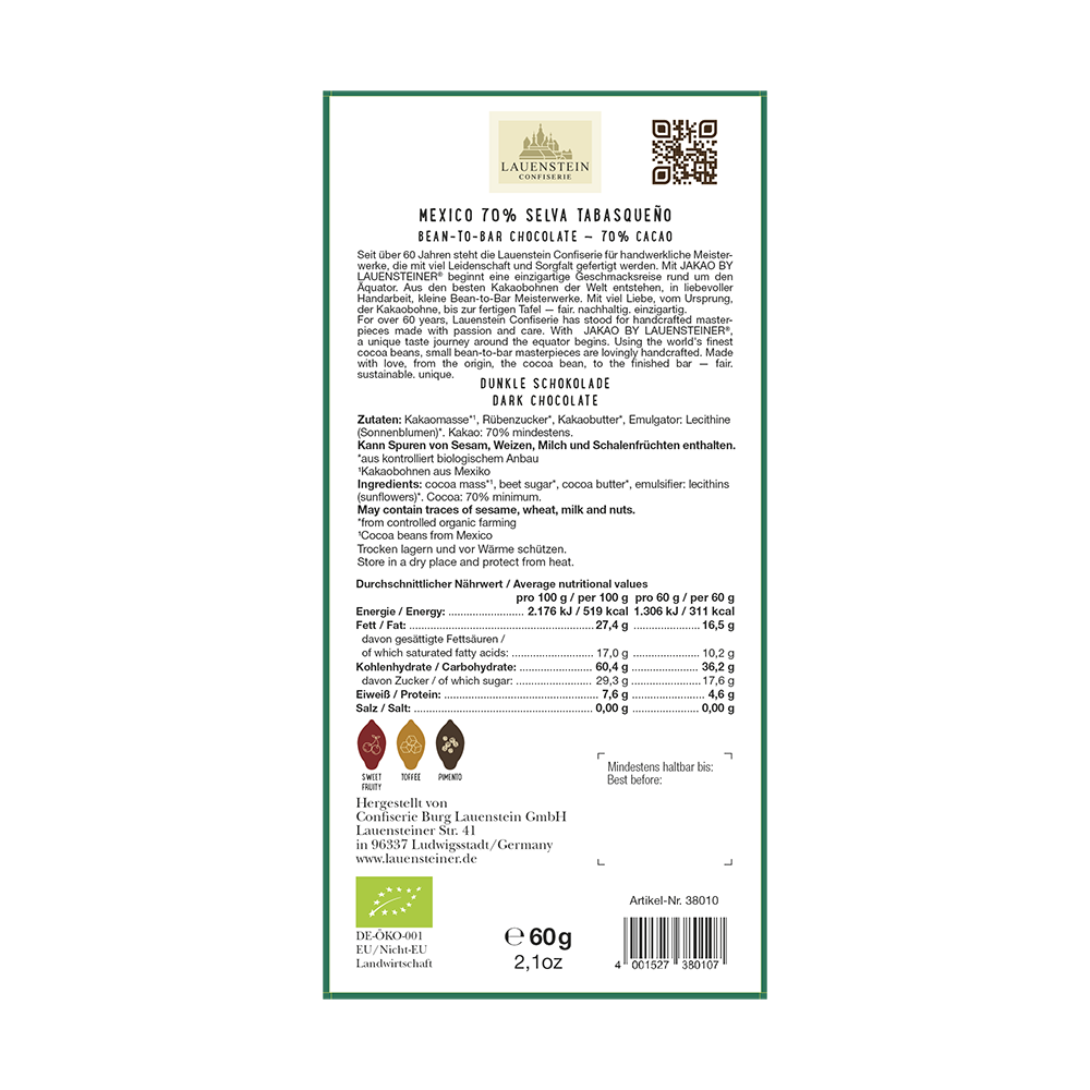 Diese Bio-Schokolade aus Acriolado-Kakaobohnen besticht durch ihre Kakaointensität mit süßen fruchtigen Noten, leichten Erd- und Gewürztönen, sowie einer angenehmen Säure.