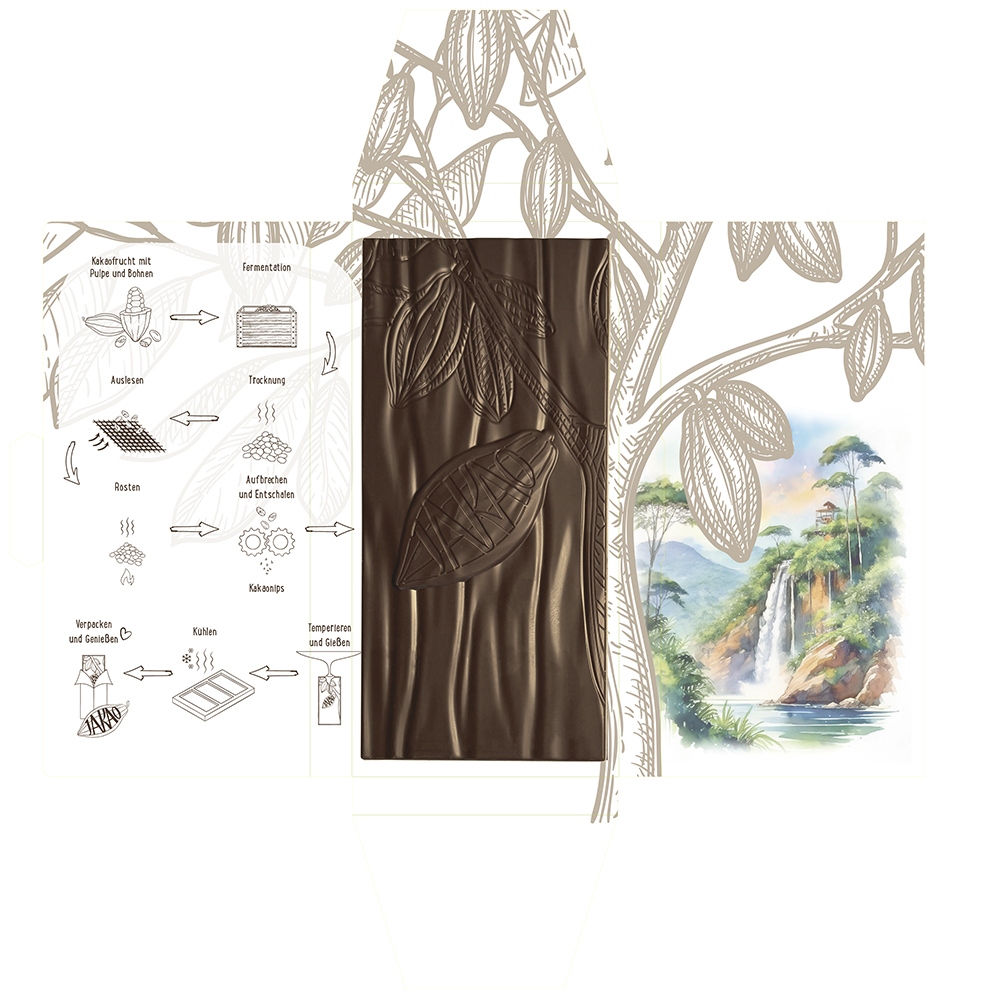 Der Kakao in dieser Schokolade wird von ca. 500 Bio-zertifizierten Kleinbauern in der üppigen Anbauregion Bundibugyo angebaut. Jeder Bauernhof ist 1–2 Hektar groß und entweder Eigentum der Familie oder von anderen Landwirten gepachtet. Neben fairen Marktpreisen erhalten die Kakaobauern eine Vielzahl an Leistungen und Schulungen zu landwirtschaft- licher Produktivität, ökologischen Praktiken, Kakaoqualität und Finanzen, sowie Unterstützung bei der Eröffnung von Bankkonten und der Aufnahme von Krediten.
