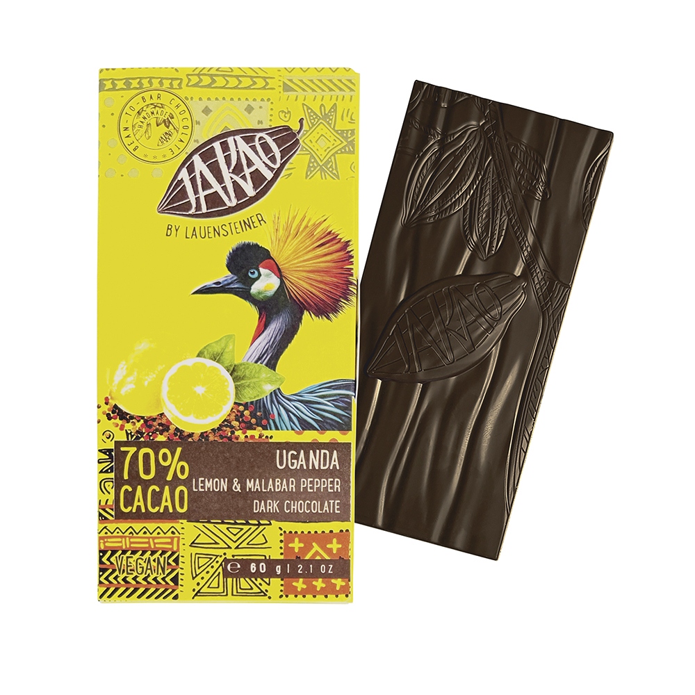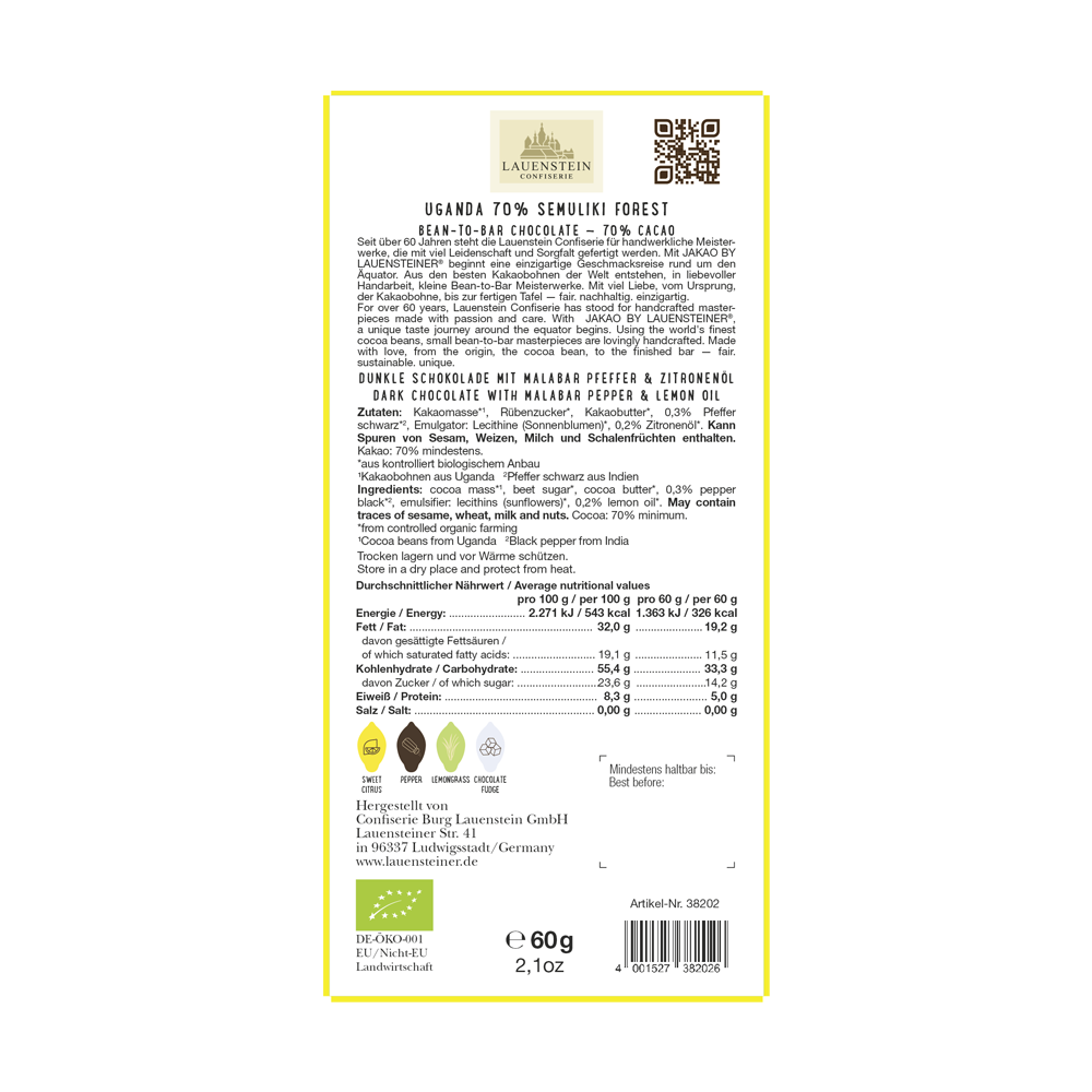 Das einzigartige Terrain des Semuliki Forest verleiht den Bohnen Geschmacksnoten von Schokoladenfudge mit fruchtigen Noten von Zitrone und Lemongras. Abgerundet wird der Geschmack mit schwarzem Bio-Pfeffer aus dem dicht bewaldeten Hinterland der Malabarküste, im Bundesstaat Kerala im Südwesten Indiens und natürlichem Zitronenöl.