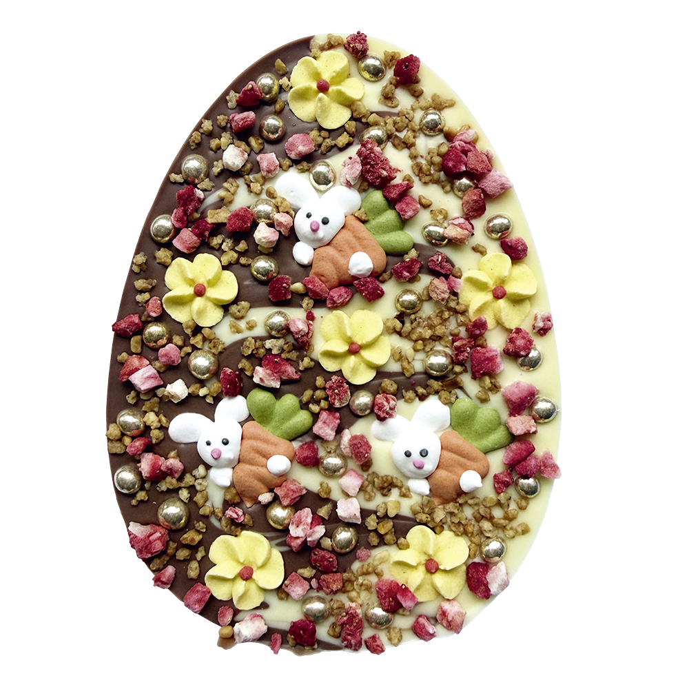 Zucker, Kakaobutter, Vollmilchpulver, Magermilchpulver, Kakaomasse, Erdbeerstücke gefriergetrocknet, Emulgator: Lecithine (Soja), Haselnüsse, Weizenmehl, Bourbon-Vanillepulver, Vanilleextrakt, Weizenvollkornmehl, Farbstoffe (Echtes Karmin, Kurkumin, Kupferkomplexe der Chlorophylle, Pflanzenkohle, Silber), Karamellzuckersirup, Rindergelatine, Stabilisatoren (Gummi arabicum, Zuckerester von Speisefettsäuren), Weizengluten, Weizenmalzmehl, Backtriebmittel (Natriumhydrogencarbonat), Überzugsmittel (Carnaubawachs), Salz, natürliches Aroma.