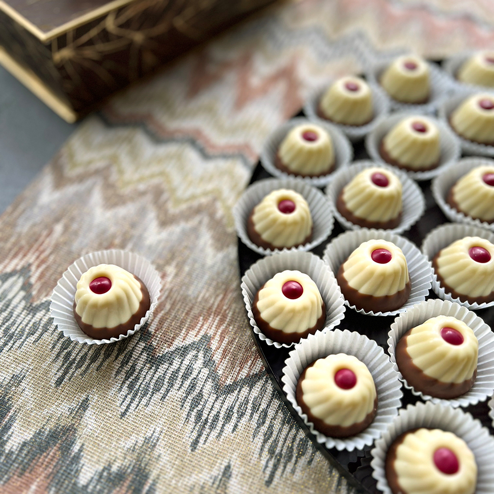Zucker, Kakaobutter, Kakaomasse, Vollmilchpulver, Haselnüsse, Eierlikör, Magermilchpulver, Schlagsahne, Butter, Orangenlikör, Glukosesirup, Bordeaux Rotwein, Wasser, Traubenlikör, Marc de Champagne, Emulgator: Lecithine (Soja, Sonnenblumen), Butterreinfett, Kakaobohnensplitter, Säuerungsmittel (Weinsäure (L+), Citronensäure), färbendes Lebensmittel (Rote Bete-Saft), Orangenschalen, Vanilleextrakt, Bourbon-Vanillepulver, Glukose-Fruktose-Sirup, Orangenöl, Farbstoffe (Echtes Karmin, Beta-Carotin), Sonnenblumenöl.