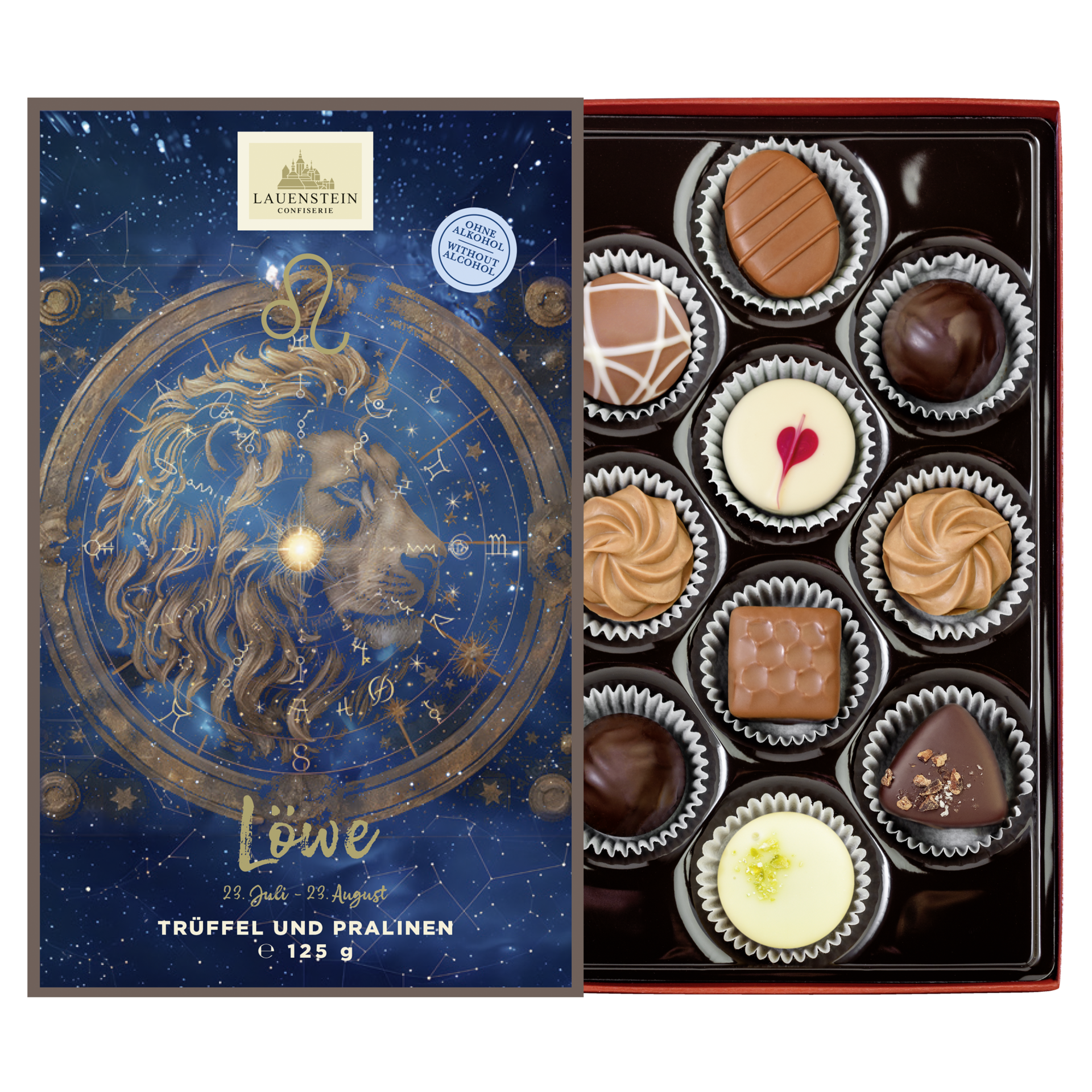 Unsere exklusive Präsentpackung enthält einen stilvollen Einschieber: Auf der Vorderseite schmückt das Symbol des jeweiligen Sternzeichens das Design, während auf der Rückseite die charakteristischen Eigenschaften liebevoll beschrieben sind.