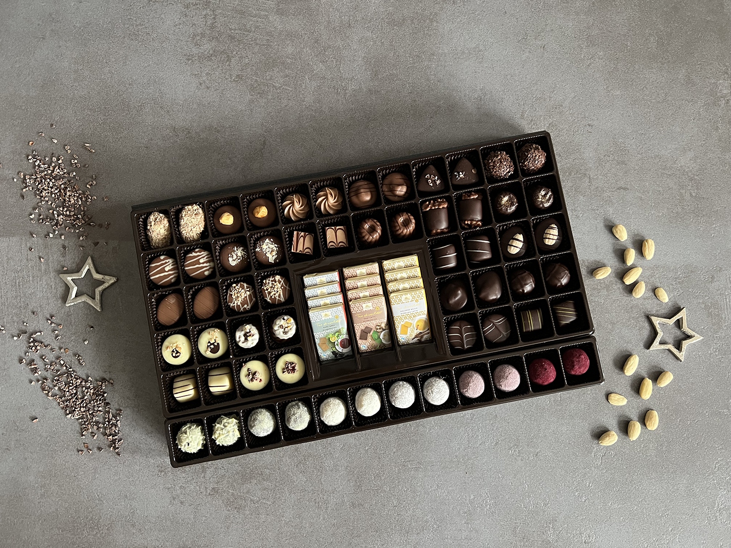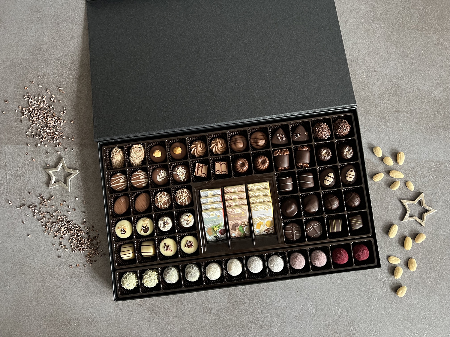 Die XXL-Version enthält fast 1.000 Gramm hervorragende Pralinenkunst in einer eleganten Schachtel.