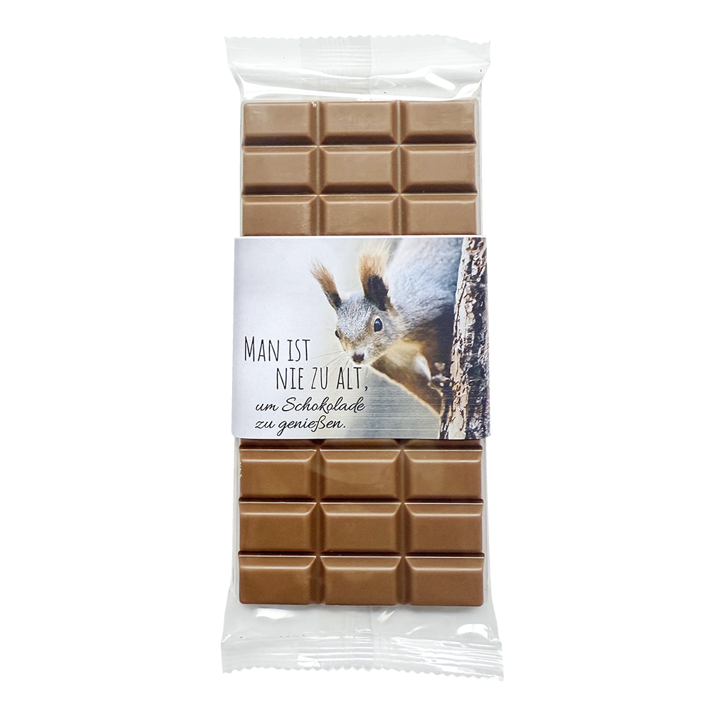 Diese zartschmelzende Vollmilchschokolade versüßt jeden Moment – ganz gleich, ob jung oder jung geblieben. Der liebevolle Spruch „Man ist nie zu alt … um Schokolade zu genießen“ macht die Tafel zu einem besonderen Highlight für Schokoladenfans mit Sinn für Humor.