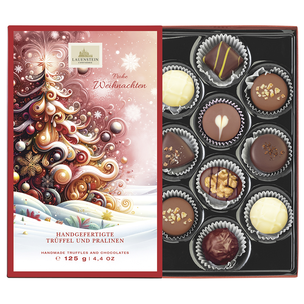 Zucker, Kakaobutter, Kakaomasse, Schlagsahne, Vollmilchpulver, Mandeln, Magermilchpulver, Haselnüsse, Eierlikör, Butter, Orangenlikör, Wasser, Walnusskerne, Glukosesirup, Jamaica Rum, Emulgatoren: Lecithine (Soja, Sonnenblumen, Raps), Butterreinfett, Invertzuckersirup, Whisky-Sahnelikör, Weinbrand, Zedernfruchtschalen, Whisky, Espressobohnen gemahlen, Wodka, Kakaobohnensplitter, Glukose-Fruktose-Sirup, natürliches Aroma, Salz, Vanilleextrakt, Feuchthaltemittel (Sorbit), Zitronensaftkonzentrat, Verdickungsmittel (modifizierte Stärke), Orangenöl, Alkohol, Maltodextrin, Bourbon-Vanillepulver, Säuerungsmittel (Citronensäure), Orangenschalen, Limettenöl, Karottenextrakt, Kurkuma.