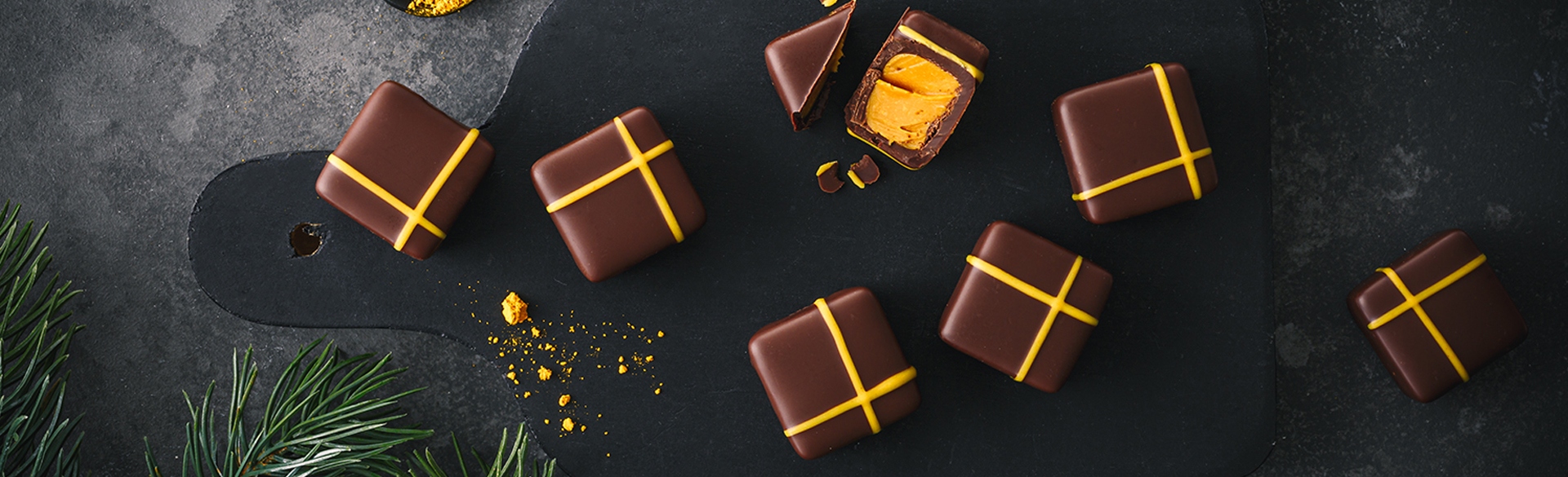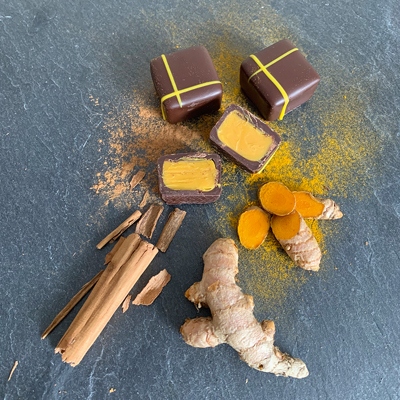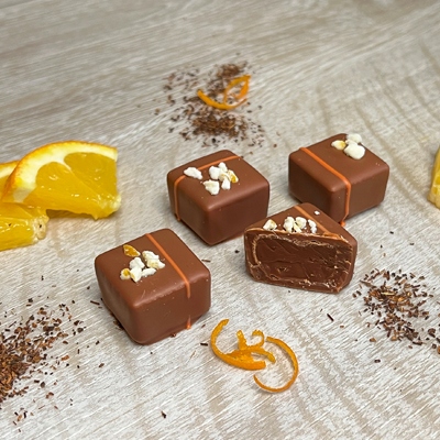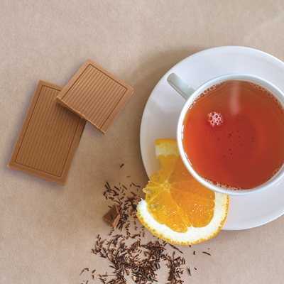 Neben „echtem“ Tee – also Schwarz- und Grüntee oder Matcha – kommen auch andere traditionelle Aufgüsse zum Einsatz. Aus den südafrikanischen Cedarbergen etwa stammt der mild-aromatische Rooibostee, der in weißer Schokolade mit Orangenstreuseln sein Confiserie-Debut gibt. Ein weiterer Aufgussklassiker: Die Goldene Milch aus dem Ayurveda, tonangebend in der Sorte „Kurkuma Latte“.