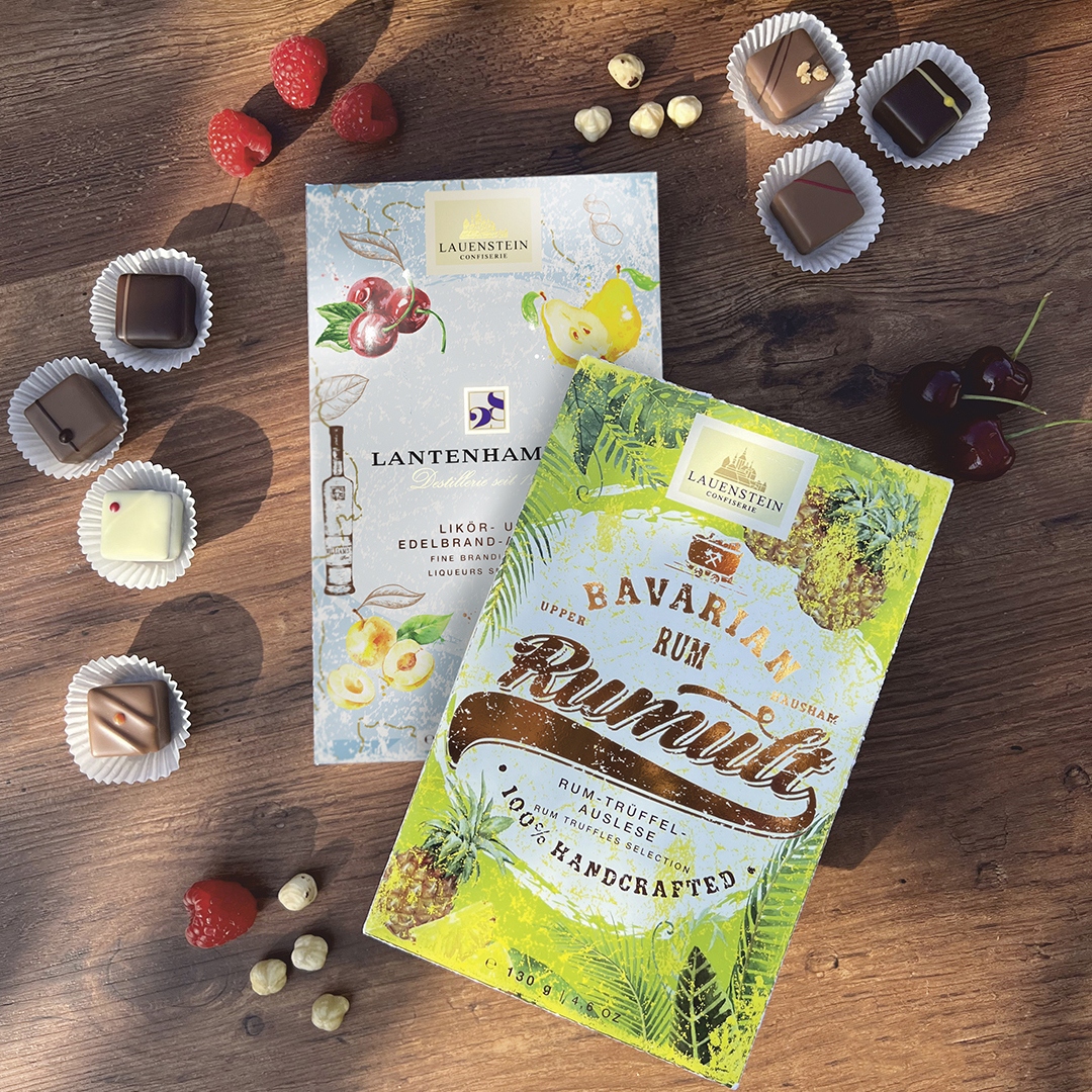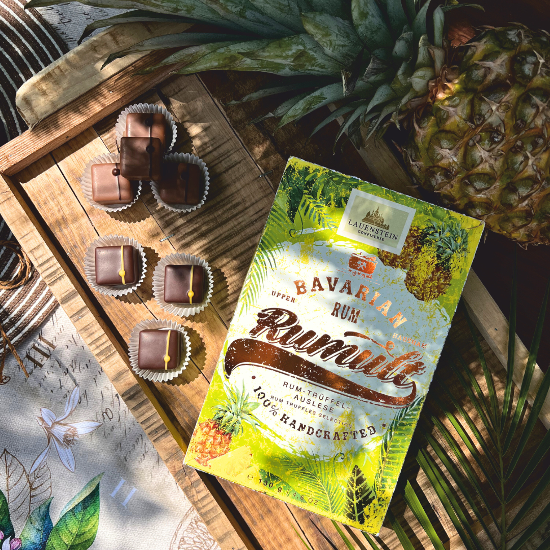 sugar, cocoa butter, cocoa mass, whole milk powder, whipped cream, 4,4% Rum, 4,1% rum liqueur, skimmed milk powder, butter, water, glucose syrup, emulsifier: lecithins (soy), cream powder, vanilla extract, Bourbon vanilla powder, sunflower oil, colouring agent (beta-carotene).